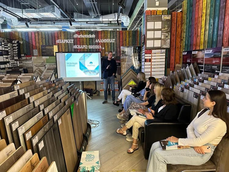 В ходе презентации провели подробный обзор ассортимента напольных покрытий. В частности, обсудили преимущества, особенности использования и основные отличия ламината и инженерной доски. Участники мероприятия отметили, что декоры инженерной доски, как никогда, актуальны и позволяют сделать любой интерьер элегантным и современным.